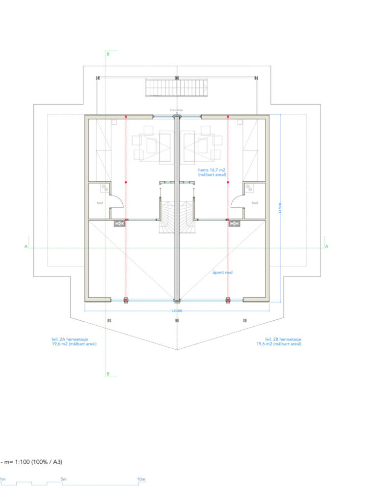 Leilighetene i 2.etg har samme romdeling nede, men har i tillegg stor gjennomlyst loftsstue hvor det også kan deles av eget soverom om ønskelig.