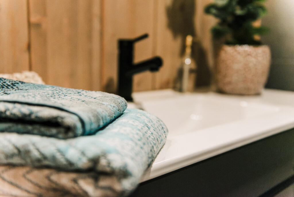 Alt sanitær-utstyr og baderomsmøbler i mørke farger.