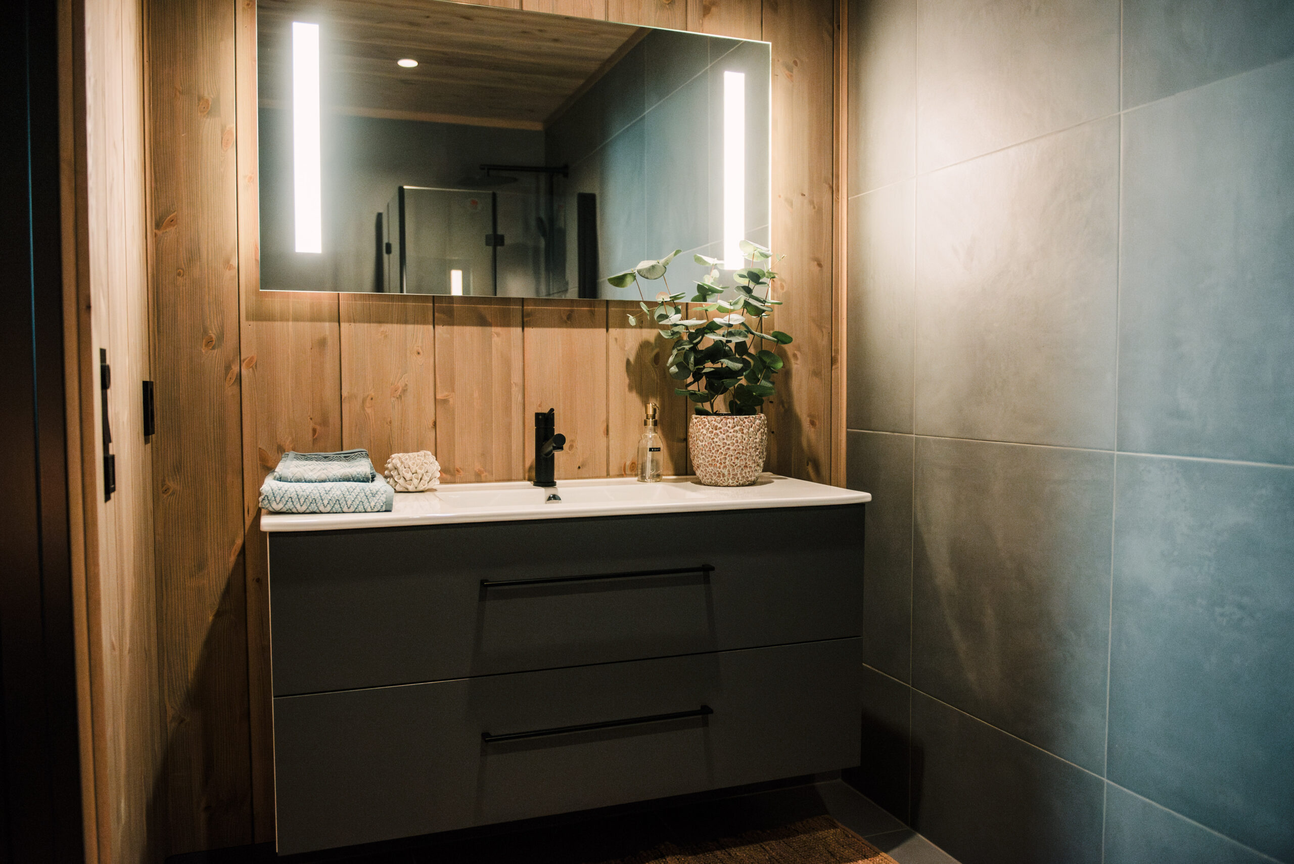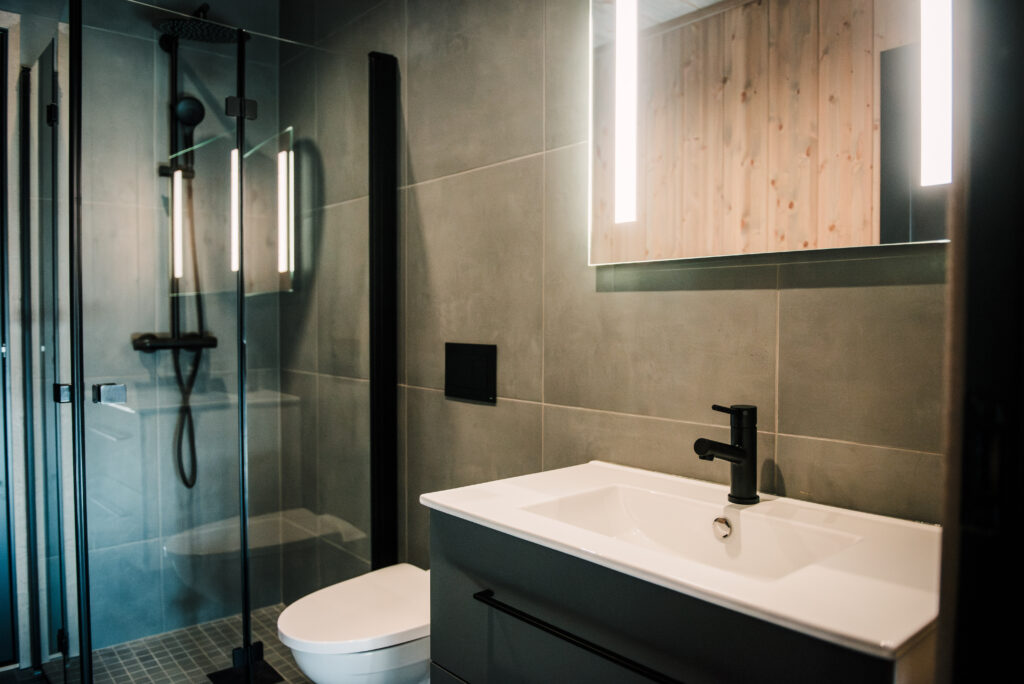 Gulv og delvis vegger i baderom, har betonggrå keramisk flis format 60×60.