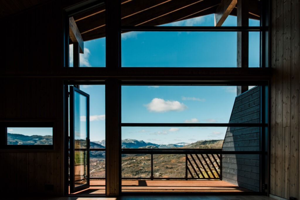 Alle ytterdører, innerdører, vindusdører og vinduer i sort utførelse. Likeledes foringer og belistning.