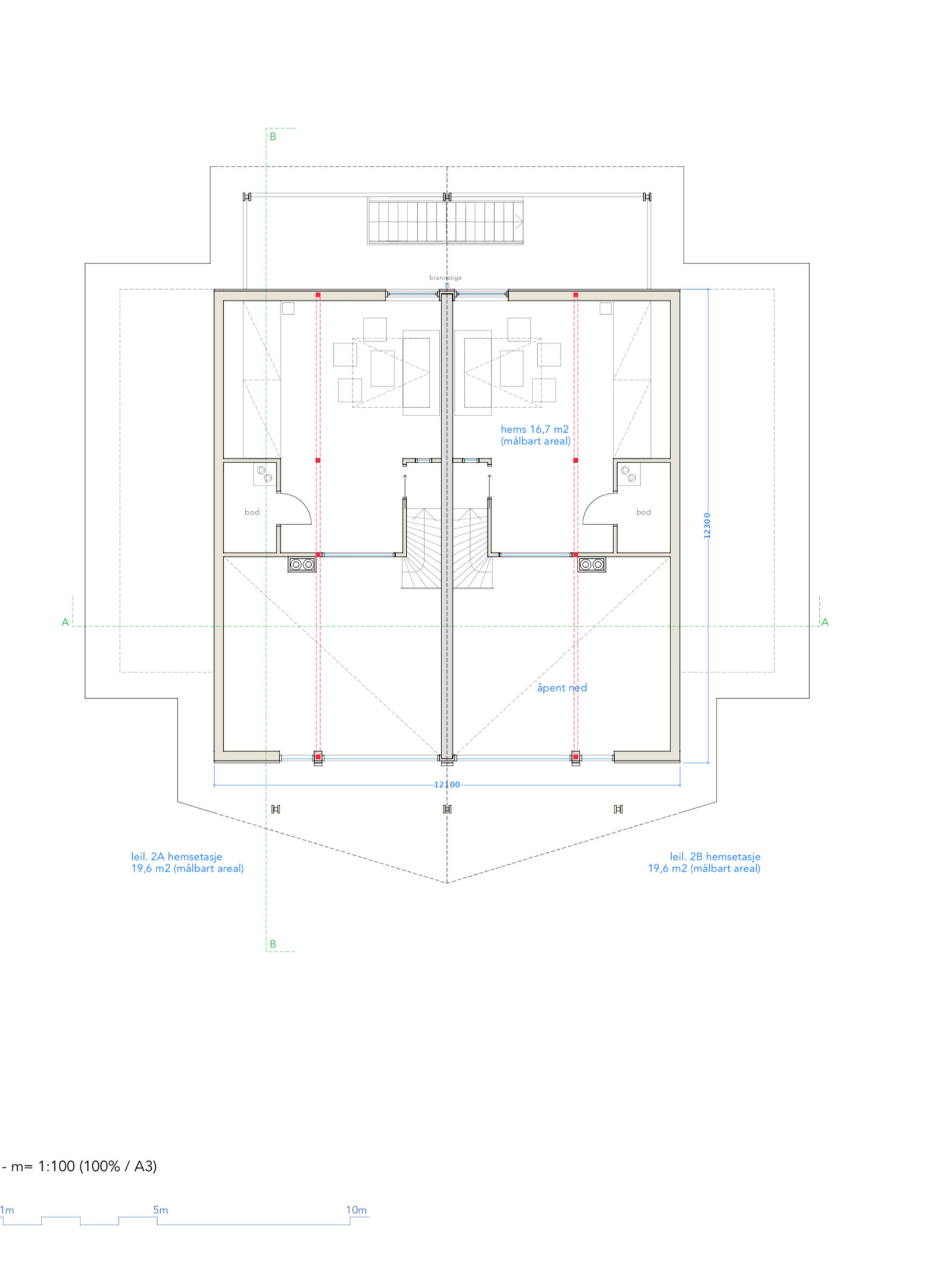 Leilighetene i 2.etg har samme romdeling nede, men har i tillegg stor gjennomlyst loftsstue hvor det også kan deles av eget soverom om ønskelig.