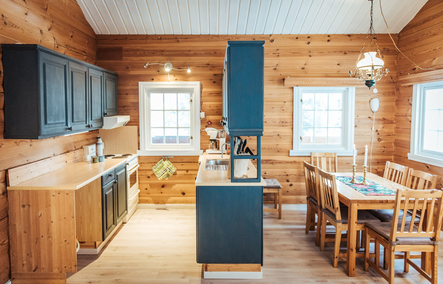 Tømmerhytte med utsikt over elva. Romsleg hytte med 4-6 sengeplassar. Tre soverom, stoge, kjøkken og bad.