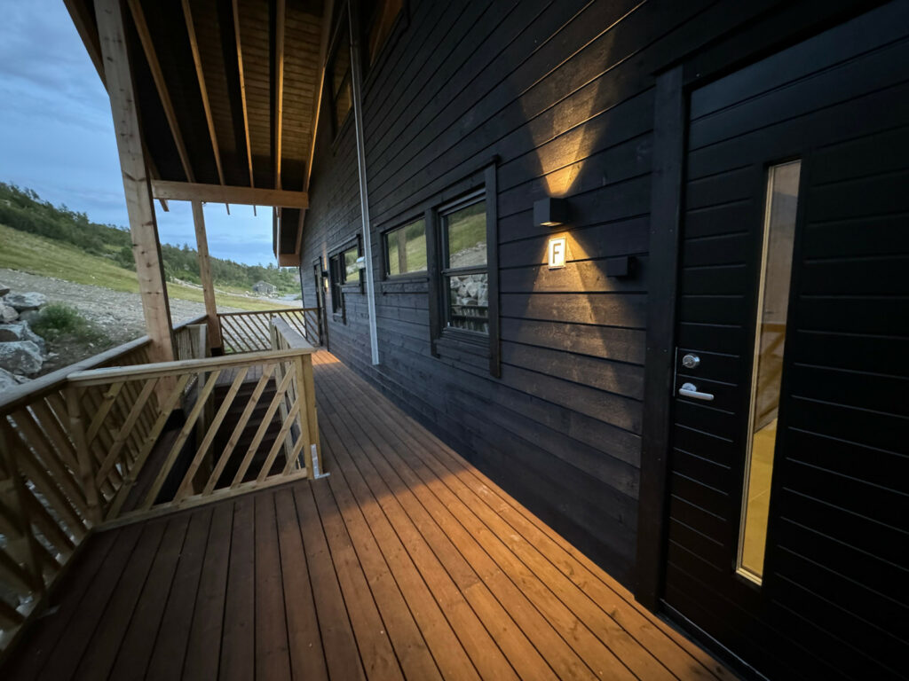 Alle ytterdører, innerdører, vindusdører og vinduer i sort utførelse. Likeledes foringer og belistning.