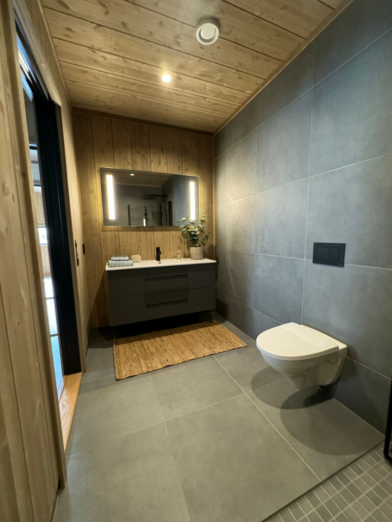 Gulv og delvis vegger i baderom, har betonggrå keramisk flis format 60×60.