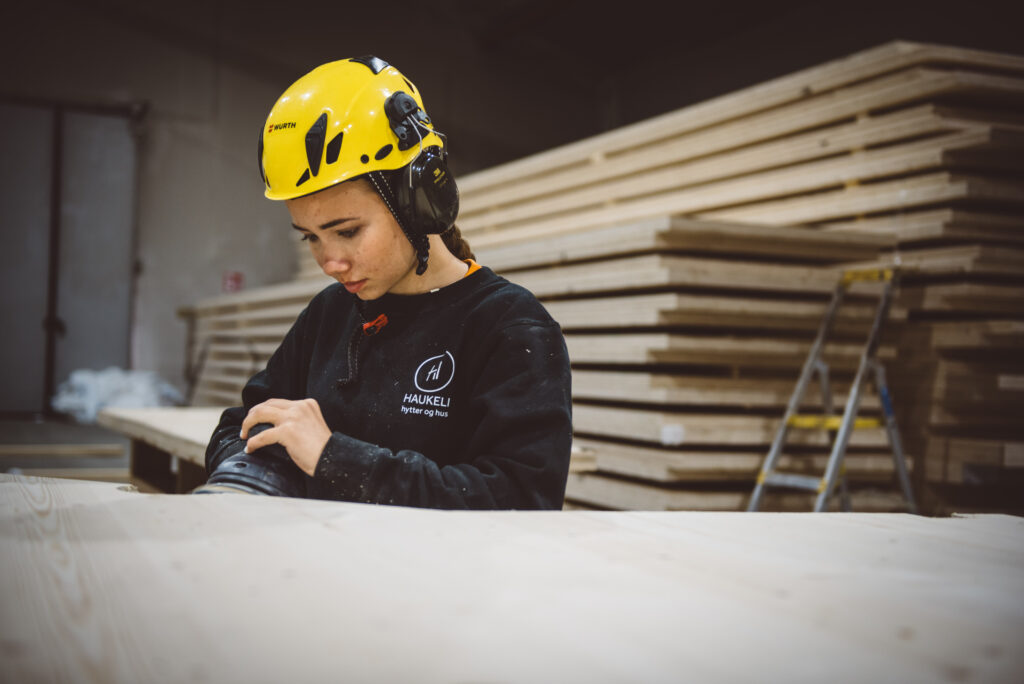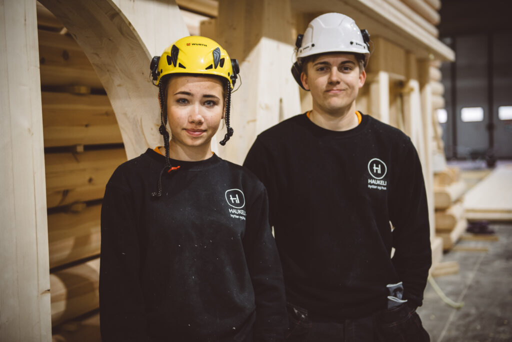 Kristine og Emil i laftehallen hjå Haukeli Hytter og Hus