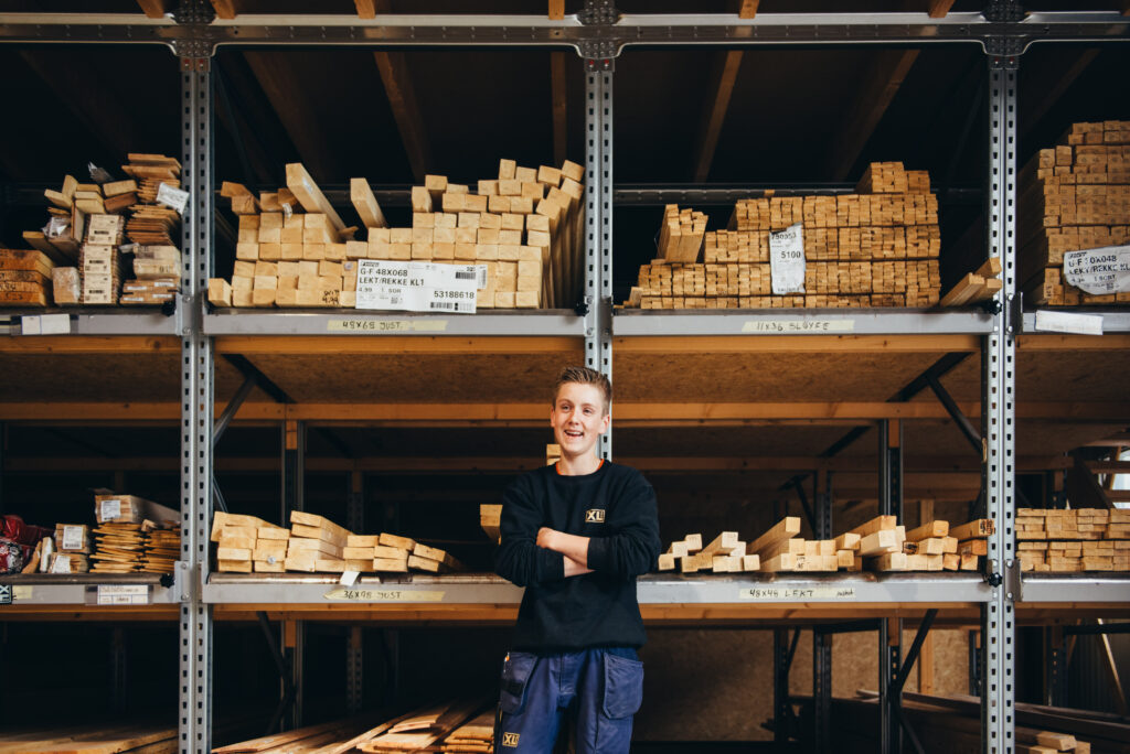 Emil Apeland har vakse opp med denne jobben. Han er no 20 år, men har allereie vore her i mange år, og set pris på at jobben er så variert. Alt frå rydding til å hjelpe til i store prosjekt, behandle ulike treverk eller krane rundt på større element. Sjølv om ikkje jobben er så relevant til det han ynskjer å studere vidare, så er det fint å få med seg litt praktisk erfaring herfrå.